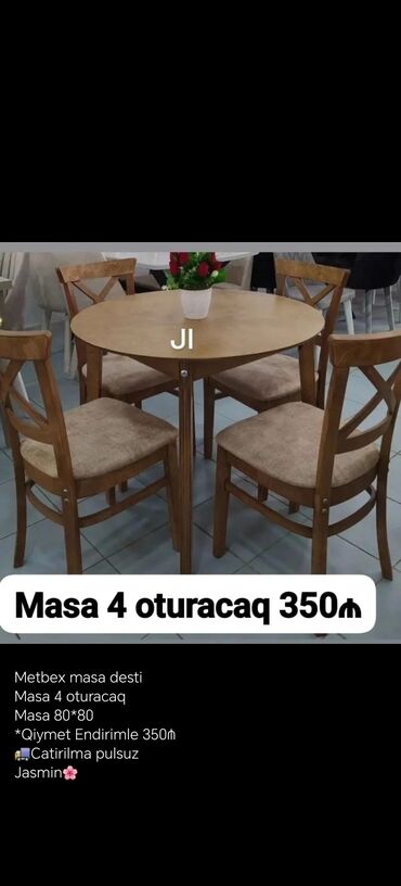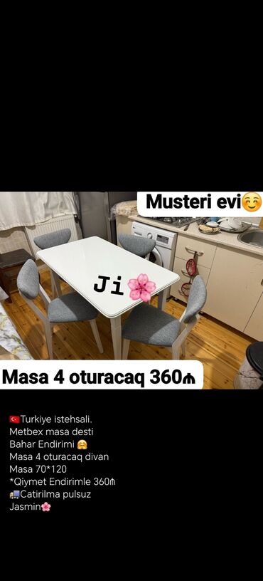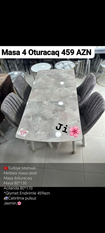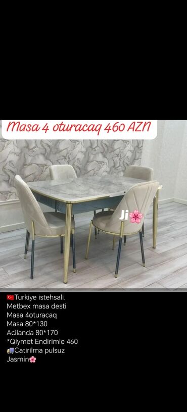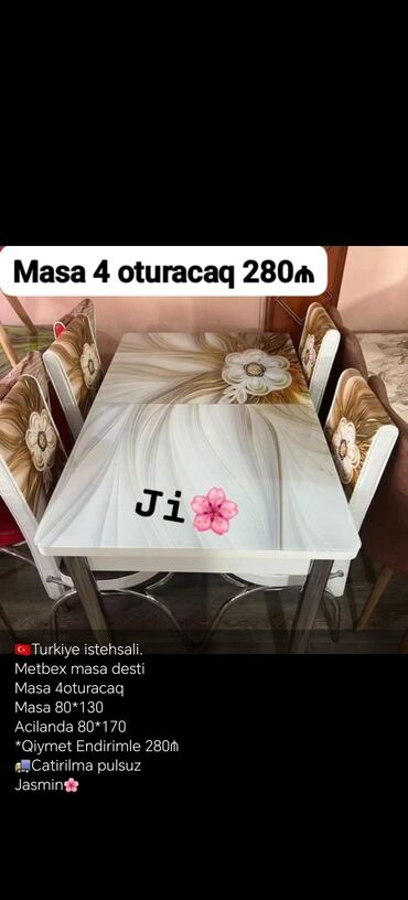 Pulsuz çatdırılmaMətbəx üçün dörd oturacaqlı stol dəsti. Türkiyə istehsalıdır. Masa 80*130 ölçüdədir, açıldıqda isə 80*170 sm olur. Şəhər daxili çatdırılma pulsuzdur.