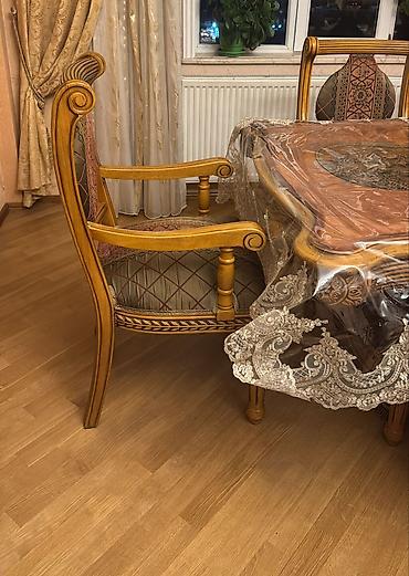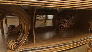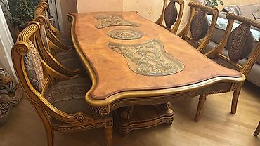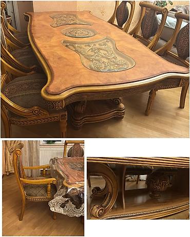 - Klassik üslubda yemək otağı dəsti - Dəst tərkibi: düzbucaqlı formalı, oyma detallı masa və yumşaq, düyməli kürsü başlıqlı stullar - Rəng: krem/ivory masa ayaqları və gövdəsi, boz məxməri/velur ti...