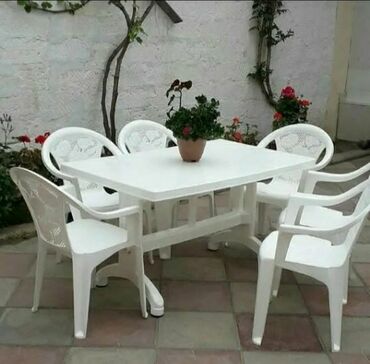 Ağ rəngli masa və 4 ədəd stul dəsti - Masa: Düzbucaqlı forma, sadə və müasir dizayn. Səth və ayaqlar eyni ağ rəngdədir, stabil konstruksiyalıdır. Yemək, kafe və ya balkon/bağ üçün uyğundur. - Stul...