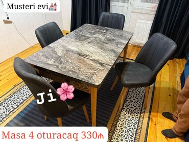 Masa və 4 oturacaq dəsti - Diktə edilmiş qiymət: 330₼ - Komplekt: 1 ədəd düzbucaqlı masa + 4 ədəd oturacaq - Masa üstü: mərmər naxışlı, möhkəm və asan təmizlənən səth - Rəng variantları: tünd boz/...