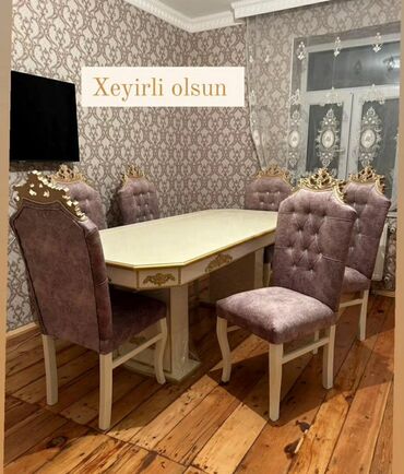 Yemək otağı üçün masa–stul dəstləri - Komplekt: 1 masa + 6 stul - Stil: Klassik/eleqant, dekorativ oyma detallar və kapitone arxa dayaqları - Rənglər: Bej və boz tonlarda müxtəlif variantlar - Mas...