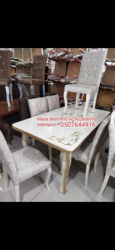Masa desti stol stul desti qonaq otağı üçün müxtəlif dizaynlarda masa–stul dəstləri. Məhsullar: - 6 oturacaqlı geniş masa dəsti. Üst səth mərmər fakturalı, dekorativ oyma elementləri və qalın daya...