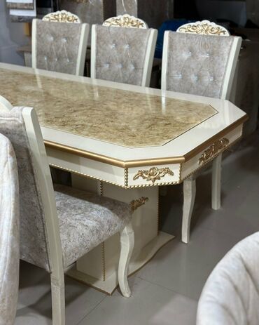 Stol stul dəstləri masa destleri Yemək otağı dəsti – masa və 6 stul - Klassik üslubda, zərif qızılı naxışlarla işlənmiş dik dayaq ayaqlı masa - Parıltılı/mermər effekti verən üst səth, yumru küncl...