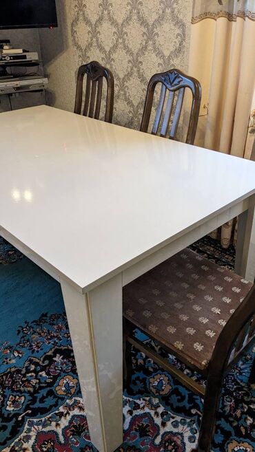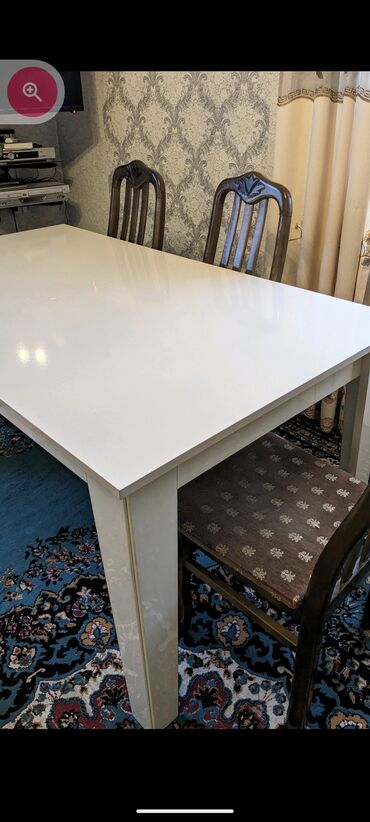 Taxta laklı dördbucaqlı masa və stullar gözə görünəcək xırda defektləri var belə stol yaxşı vəziyyətdədir,stullardan 2 sinin defekti var.Masa açılır.Normal uzunluqda olur.İşlənmişdir yenisi alınaca...