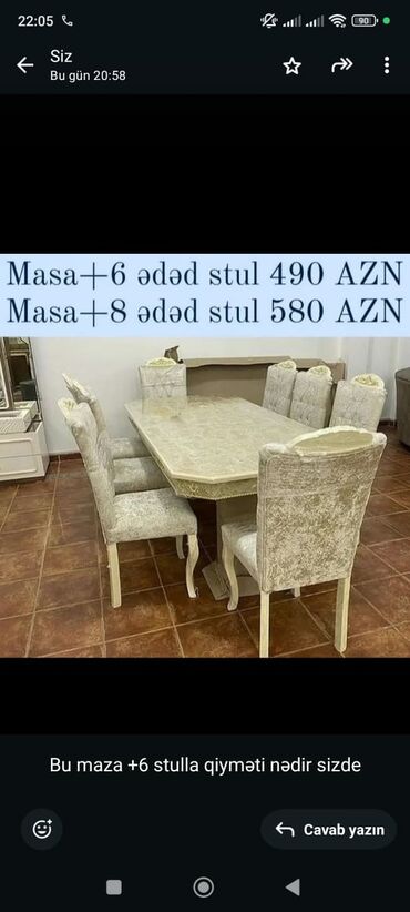 Mətbəx stol stul desti Endirimli yemək masası dəsti - Komplekt: 1 masa + 4 ədəd stul - Qiymət: 330 AZN (şəkildə göstərilib) - Dizayn: Aşağı hissədə oyma naxışlı dekor, taxta ayaqlar - Masa üstü: m...