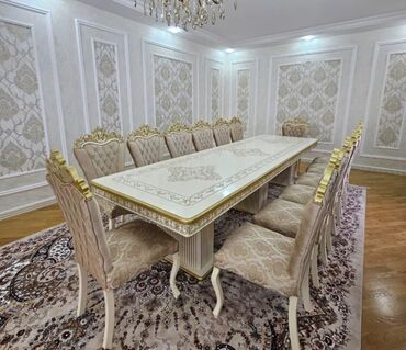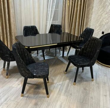 Yeni sifarişlə hazırlanan yemək masası və stul dəstləri. Variantlar: - Qara-qızılı klassik dizayn: oymalı başlıqlı, yumşaq süngərlə çəkilmiş parça üzlü 6–8 stullu model, oval və ya düzbucaqlı masa...
