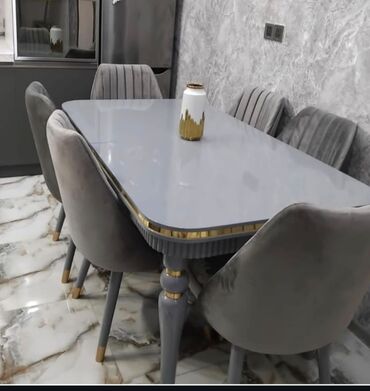 Masa dəsti stol stul dəst Məişət və qonaq otaqları üçün masa‑stul dəstləri - Müxtəlif dizaynlar: klassik qızılı detallar ilə ağ masa dəsti, modern qara mərmər effektli üstlü masa və yumşaq oturaca...
