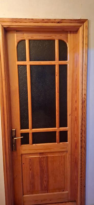 - Otaq qapısı: Təbii ağacdan hazırlanmış klassik dizayn, üst hissədə dekorativ şüşə panellər, taxta karkas və üzlük, metal qolluq və kilid mexanizmi ilə.
