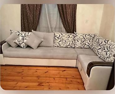 - Yumşaq künc divan dəsti: L formalı, ikirəng (bej və qəhvəyi) parça üzlüklə. Geniş oturacaq və arxalıqlar, çıxarıla bilən iri yastıqlar. Hər iki qol hissəsində funksional tumbalar: biri üst qapaql...