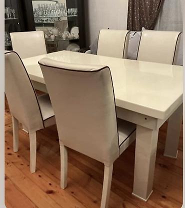 İstifadə olunmayıb yeni kimidir. Yenədə razılaşma olacaq. Qonaq otağı mebel dəsti Tərkibi: - 6 stul ilə iri yemək masası – qara mərmər naxışlı parlaq üstlük, krem rəng karkas, qızılı oyma ayaqlar...