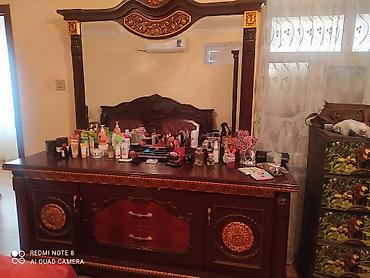 - Tualet masası və böyük güzgü: Geniş masaüstü, sağ-sol qapalı bölmələr və mərkəzdə çəkməcələr. Üst hissədə iri çərçivəli güzgü, klassik oyma və qızılı detallarla bəzədilib.