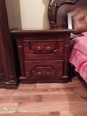 - Komodin (gecə tumbası): İki geniş çəkməcə, massiv taxta gövdə, dekorativ profillər və dairəvi tutacaqlar.