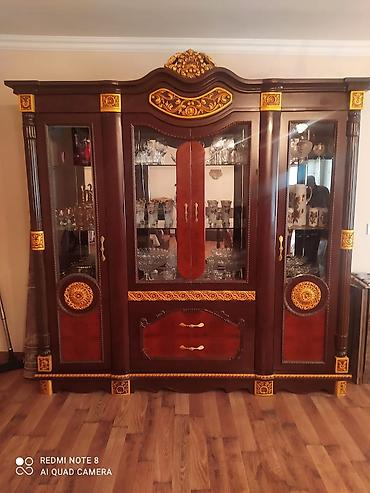 - Servant/vitrin şkafı: Dördbölməli iri konstruksiya, şüşəli vitrin qapıları, daxildə rəflər və stəkanlıq üçün geniş yer. Aşağı hissədə 2 çəkməcə və mərkəzdə qapalı bölmə. Qızılı dekorativ elementlər, yuxarı tağ hissədə oyma başlıq.