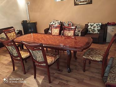 - Yemək masası və 6 ədəd stul: Küllü qəhvəyi-rəngli, oyma naxışlı massiv taxta karkas, parlaq lak örtük. Masanın üstü dekorlu, kənarları profilli; stulların arxa söykənəcəyi oyma elementli, oturacaq və söykənəcəklər klassik ornamentli parça ilə üzlənmişdir.