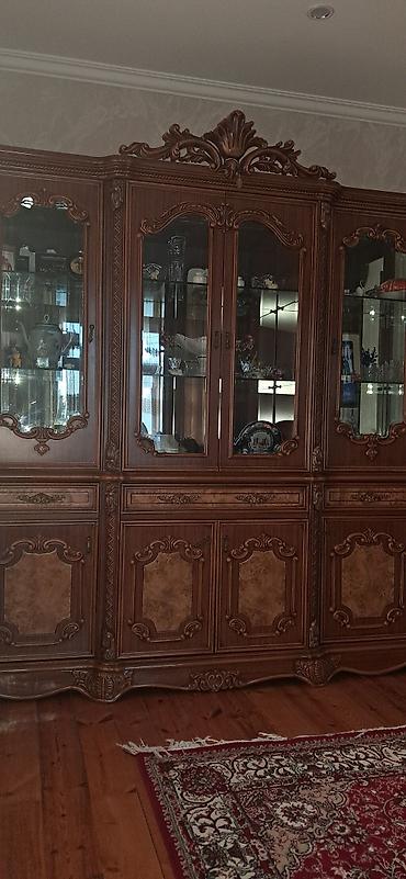 Klassik üslubda qonaq otağı dəsti - Şkaf-vitrin: Təmiz taxta konstruksiya, tünd qəhvəyi rəng, zəngin oyma dekorlar. Üst hissə şüşəli vitrin (3 bölmə) – qab-qacaq və dekor üçün rəfli. Aşağı hissədə...