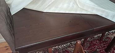 - Masa: Tünd qəhvəyi/qoz rəngində massiv taxta üstlük. Ortadan artırıla bilən (açılıb-böyüyən) konstruksiya, kənarları profilli.