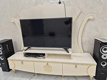 Klassik üslubda qonaq otağı mebel dəsti Tərkibi: - TV altdlığı: açıq rəngli, oval bucaqlı üst tabla, mərkəzdə açıq rəf bölməsi; aşağıda iki iri çekmece. Ön panellərdə barokko naxışlı dekorativ tut...