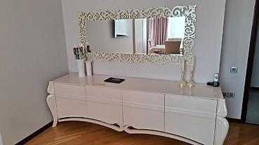 Klassik üslubda qonaq otağı mebel dəsti Tərkibi: - Vitrin şkaf: Şüşə qapılı, 3 səviyyəli şüşə rəf, aşağı hissədə 2 qapılı bölmə. Üst hissədə və ayaqlarda qızılı naxışlı dekor elementləri, yumru fo...