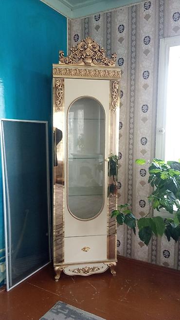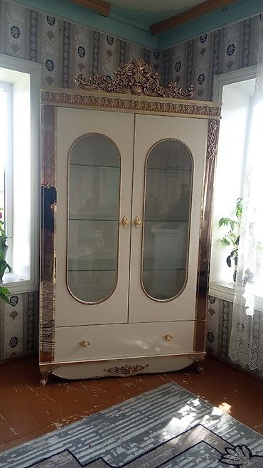 - 2 ədəd vitrin şkafı – krem rəng korpus, qızılı ornament və tac dekoru, şüşə qapılar və rəflər, aşağı hissədə çekmece; biri iki qapılı iri vitrin, digəri tək qapılı dar vitrin.