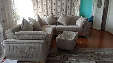 - Künc divan – L formalı, açıq boz parça üzlük, dik dayaqlı və yumşaq oturacaqlar, 6 ədəd böyük dekor yastıq, yan tərəflərdə qızılı xətt və halqa dekoru, metal dayaqlar; uyğun puf/oturacaq daxildir.