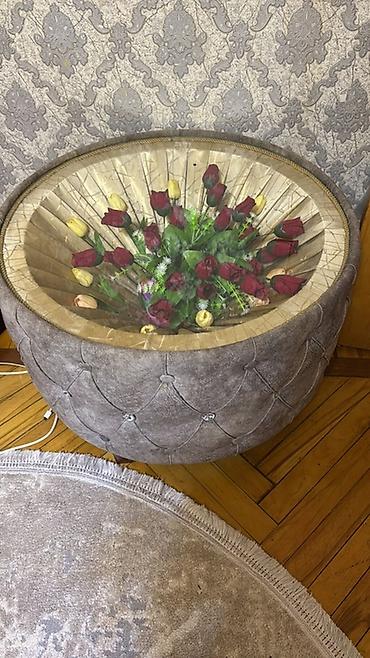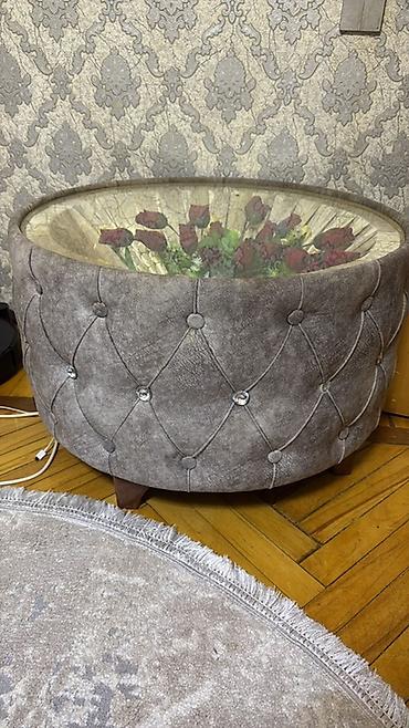 - Oturacaq/çay masası (puf-stol): Dairəvi formadadır, üstü şüşəlidir. Şüşə altında dekorativ güllər kompozisiyası görünür. Korpus yumşaq toxumalı boz parça ilə düymələmə (kapitone) işləməli, bəzək üçün kristal tipli düymələrdən istifadə olunub. Aşağısında taxta ayaqlar.