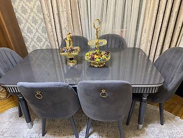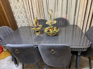 İstifadə olunmayıb yeni kimidir. Yenədə razılaşma olacaq. Qonaq otağı mebel dəsti Tərkibi: - 6 stul ilə iri yemək masası – qara mərmər naxışlı parlaq üstlük, krem rəng karkas, qızılı oyma ayaqlar...