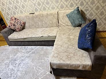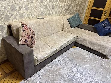 Mebel dəsti – 850 manat - Künc divan: tünd boz rəngdə, yumşaq parça üzlü, qızılı dekorativ zolaqlar və ayaqlar. Komplektdə uyğun dekorativ yastıqlar. - Yemək dəsti: oval formalı masa – tünd boz-qı...