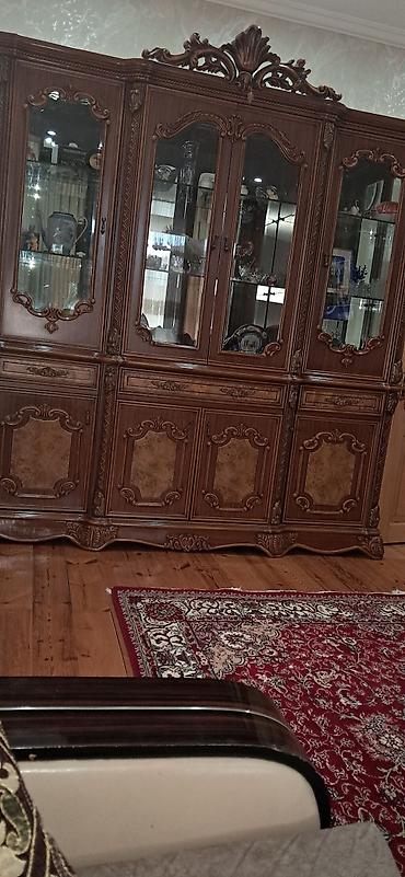 - Vitrinli böyük bufet: Tünd qəhvəyi, zəngin oyma naxışlı fasad, şüşə qapılar və şüşə rəflər. Üst hissədə dekorativ tac elementləri. Aşağı bölmədə qapalı şkaflar və çekmece tipli panellər, saxlama üçün geniş yer. Metal tutacaqlar, dekorativ frez və relyef detallarla bəzədilib. Yemək və çay dəstləri, kristal və suvenirlər üçün idealdır.