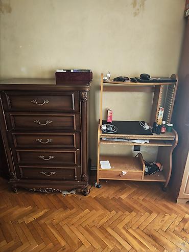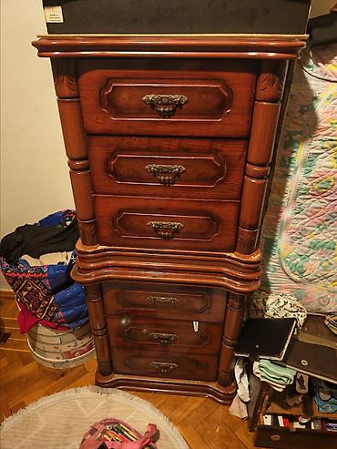 - Taxta komod: Üst-üstə iki bloklu quruluş, ümumilikdə çoxsaylı çekmece; oyma detallı sütunlar və relyefli fasadlar; metal dekorativ tutacaqlar; parlaq tünd qəhvəyi örtük.
