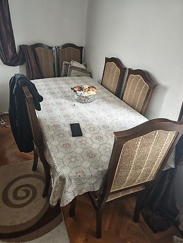 - Yemək masası və 6 ədəd stul: Uzunsov masa; stullar taxta karkaslı, arxa hissəsi dekorativ tekstil panel ilə; qəhvəyi-bej tonlarda, klassik xətlər.