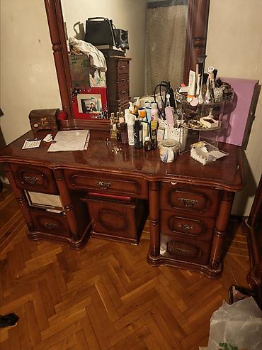 - Güzgülü makiyaj/konsole masası: Geniş taxta üstlük, böyük vertikal güzgü çərçivəsi; hər iki tərəfdə çoxsaylı çekmece; ortada açıq bölmə; klassik oyma və qabarıq konturlar; bürünc rəngli tutacaqlar.