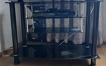 - TV stendi: qara şüşə rəflər və metal sütunlarla; bir neçə səviyyəli saxlama sahəsi – televizor, pleyer, oyun konsolu və aksesuarlar üçün uyğundur; məhdud məkanda səliqəli yerləşim.