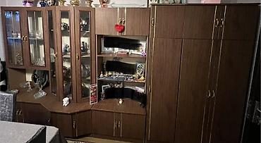 - Divar vitrini/sekret: qoz rəngli lamina örtük, şüşəli vitrin qapıları, daxili rəflər; mərkəzdə açıq niş və aşağı hissədə geniş dolab modulları; sağ blokda hündür şkaf bölmələri; qızılı rəngli tutacaqlar və zolaq dekoru.