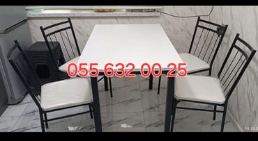 Mətbəx/yemək masası və stul dəstləri, həmçinin iş masası - 4 nəfərlik yemək masası dəsti: ağ rəngdə, sadə və möhkəm konstruksiya. Metal karkaslı stullar, oturacaq və bel hissəsi süni dəri ilə üzlə...