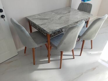 Mətbəx mebeli mətbəx masa desti Yemək otağı dəsti – 1 stol + 4 stul - Stol: mermər naxışlı üst səth, dekorativ oyma ön panel, taxta ayaqlar. - Ölçü: təxminən 4 nəfərlik rahat oturuş. - Stullar: yu...