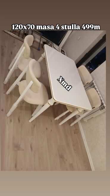 120x70 yemək masası dəstləri Variant 1: - Masa ölçüsü: 120 x 70 sm - Komplekt: 4 ədəd stul - Rəng: ağ üstlük, qara ayaqlar; krem rəngli yumşaq oturacaqlar - Qiymət: 399 ₼ (şəkildə göstərilib) - İs...