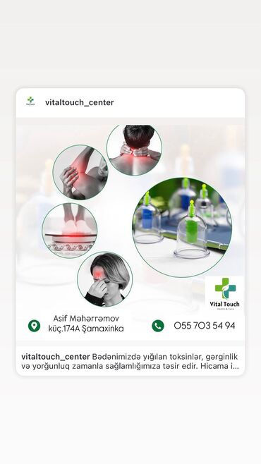 Xidmət: Hicama, hirudoterapiya və masaj - Hicama terapiyası: Bədənin müəyyən nöqtələrinə vakuum bankaları tətbiq edilərək qan dövranının stimullaşdırılması və əzələ gərginliyinin azaldılması məqsə...