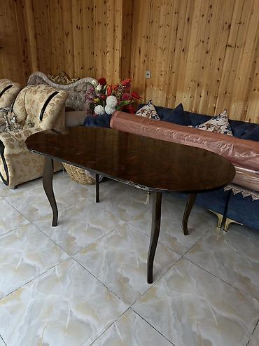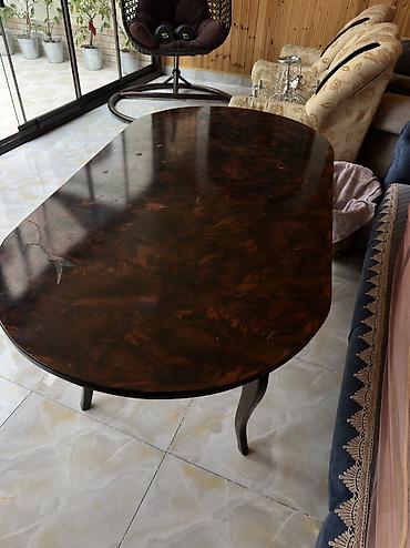 Masa – klassik-modern üslubda, geniş yemək/konfrans masası - Üst hissə: Qəhvəyi tonlarda parlaq taxta səth, yumşaq radiuslu künclər və dekorativ kant - Ölçü təsviri: Uzunsov düzbucaqlı forma; 6–8 ...