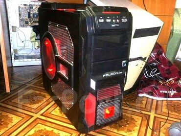 Masaüstü kompüter korpusu – LED ventilyatorlu, şüşə panel - Ön panel: parlaq qara dizayn, yanlarda hava girişi üçün perforasiya, içəridə mavi LED işıqlı ön ventilyatorlar görünür. - Sol tərəf: tem...