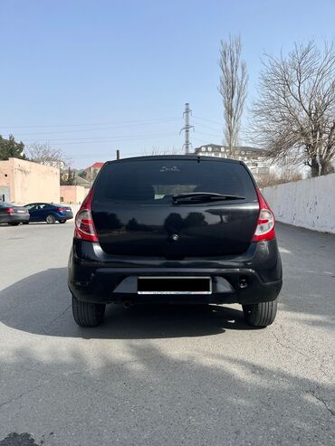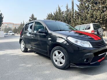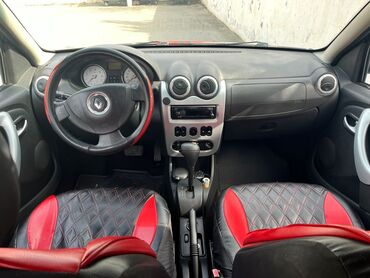 Ağ rəngli Renault Sanderos tepwayy suv hetçbek avtomobili. Avtomobilin damında baqaj üçün relslər, ön tərəfində dairəvi duman əleyhinə işıqlar, arxa tərəfində isə qara plastik qoruyucu bufer var. ...