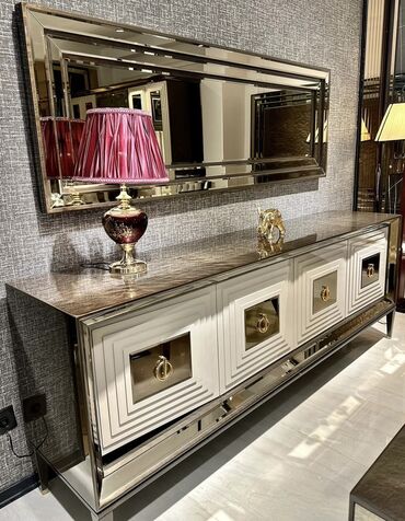 - TV tumbası/konsole: parlaq metalik karkas, mərmərəbənzər üst səth, ön paneldə relyefli çərçivələr və güzgülü inserlər, qızılı halqa formalı tutacaqlar; geniş saxlama bölmələri.