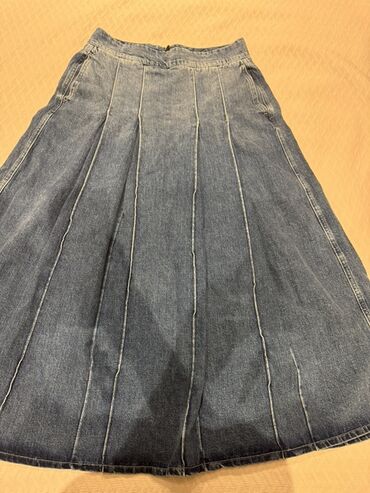 Geniş kəsimli denim ətək - Material: klassik açıq-mavi cins (denim) - Dizayn: ön hissədə tikiş xətti və yüngül solğun effekt; alt kənarı təbii kəsim görünüşlü - Bel: kəmər üçün ilmələr, ön düymə v...