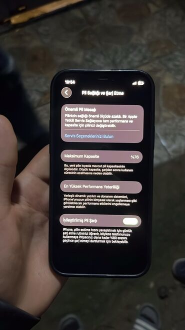 - iOS batareya bölməsində maksimum kapasite 76% göstərilir; sistemdə “Önemli Pil Mesajı” bildirişi mövcuddur