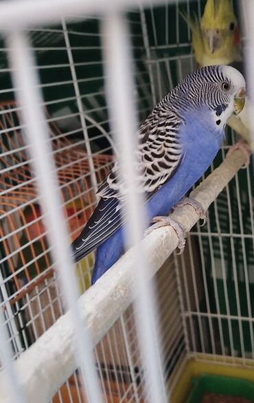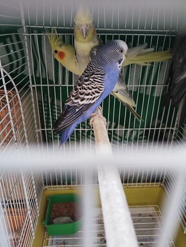 Qeyd: Şəkillərdə quş ağ barlı metal qəfəsdədir; arxa planda nimfa kakadu quşları görünür. Bu elanda yalnız mavi dalğalı bülbül təsvir olunur.