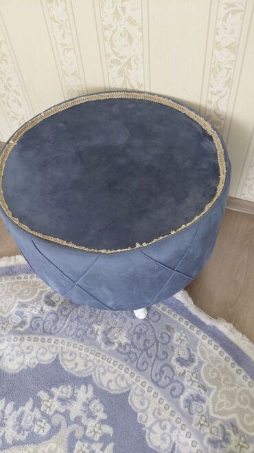 Mavi rəngli dəst: geniş divan və yuvarlaq puf