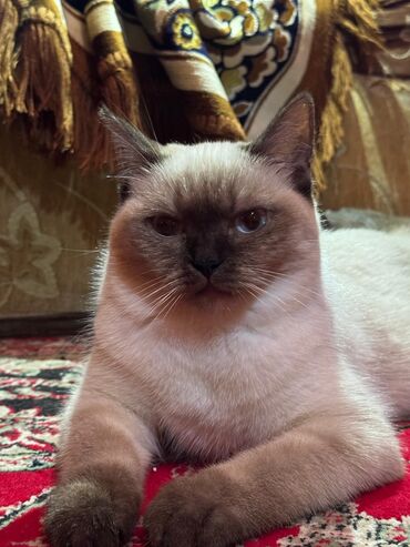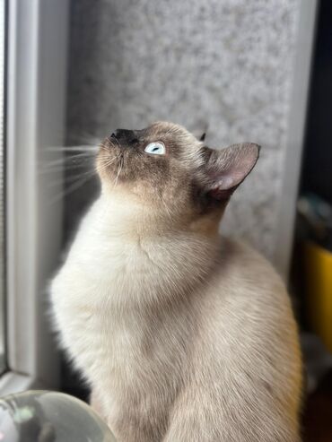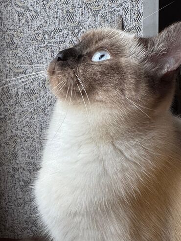 Siam cinsli ev pişiyi - Rəng: klassik “seal point” – tünd maskalı üz, qulaqlar, pəncələr və quyruq; bədən krem-qəhvəyi. - Gözlər: parlaq mavi. - Xüsusiyyətlər: səliqəli, öyrədilmiş, ev şəraitinə u...