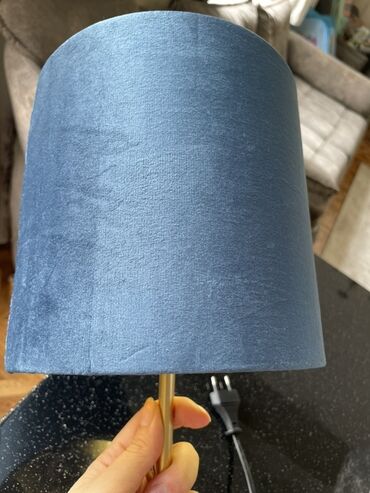- Dizayn: Zərif qızılı metal gövdə və altlıq, məxmər teksturalı tünd mavi silindrik abaşur. Abaşurun iç tərəfi qızılı rəngdədir – isti, yumşaq işıq effekti yaradır.
