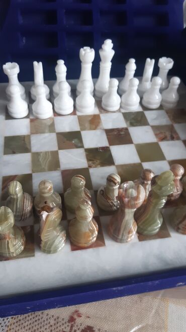 Mərmər/Oniks şahmat dəsti - Taxta: ağ və zeytun-yaşılı tonlarda mozaika şəklində yığılmış cilalı daş kvadratlar (mərmər və oniks teksturalı). - Fiqurlar: iki rəng dəsti. - Ağ komanda — parlaq ağ...