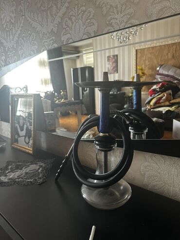 Kalyān (şişə nərgilə) komplekti - Rəng: qara şüşə baza, mavi/göy gövdə, qara şlanq - Materiallar: qalın şüşə baza, metal/gövdə hissələr, silikon şlanq - Üst hissə: keramika/qara kasa, kömür qapağ...