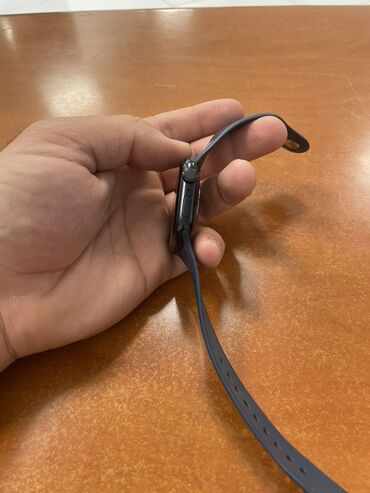 Ağıllı saat – kvadrat korpuslu, tünd rəngli (ehtimalən qara/boz) korpus və mavi silikon kəmər.